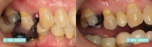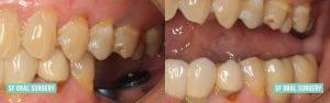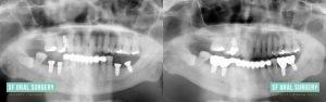 Patient presented to our office with multiple non-restorable teeth, unfortunately, due to medication-related "dry mouth." His treatment plan included full mouth extractions of his remaining teeth, bone grafting, and same day rehabilitation by placing immediate implants and immediate temporary prostheses, or "bridges." The patient was able to leave our office with a full complement of teeth and was able to eat a "soft diet." Case performed with: Dr. Sukhmani Singh and Dr. Samuel Chiu